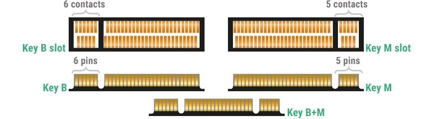 - The Key B supports PCIe x2, SATA, and USB, making it suitable for SATA/PCIe SSDs and LTE/5G modems.