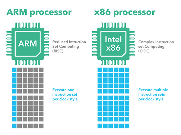 x86 (CISC) architectures, on the other hand, employ a Complex Instruction Set that allows each instruction to perform several operations per cycle. This reduces the total instruction count and delivers higher computational density, ideal for multitasking and performance-intensive environments.